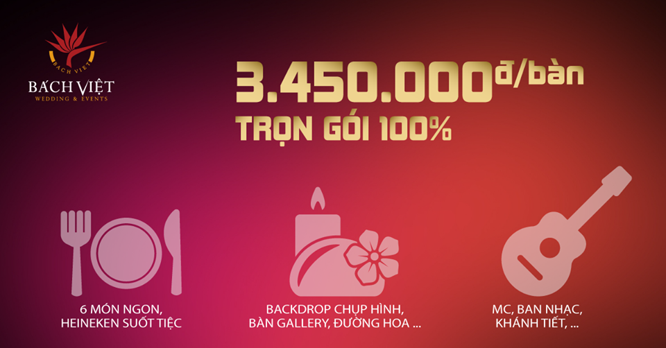 Bách Việt với hơn 15 năm kinh nghiệm tổ chức tiệc cưới cho hàng trăm cặp đôi sẽ mang đến cho bạn những dịch vụ cưới chất lượng và chuyên nghiệp. Bách Việt hiện đang áp dụng chương trình ưu đãi: “Chỉ với 3.450.000đ/ bàn tiệc, bạn sẽ có một tiệc cưới hoàn hảo, trọn gói đúng nghĩa tại nhà hàng sang trọng ngay trung tâm thành phố mà không phải bỏ thêm bất kì chi phí nào khác”.